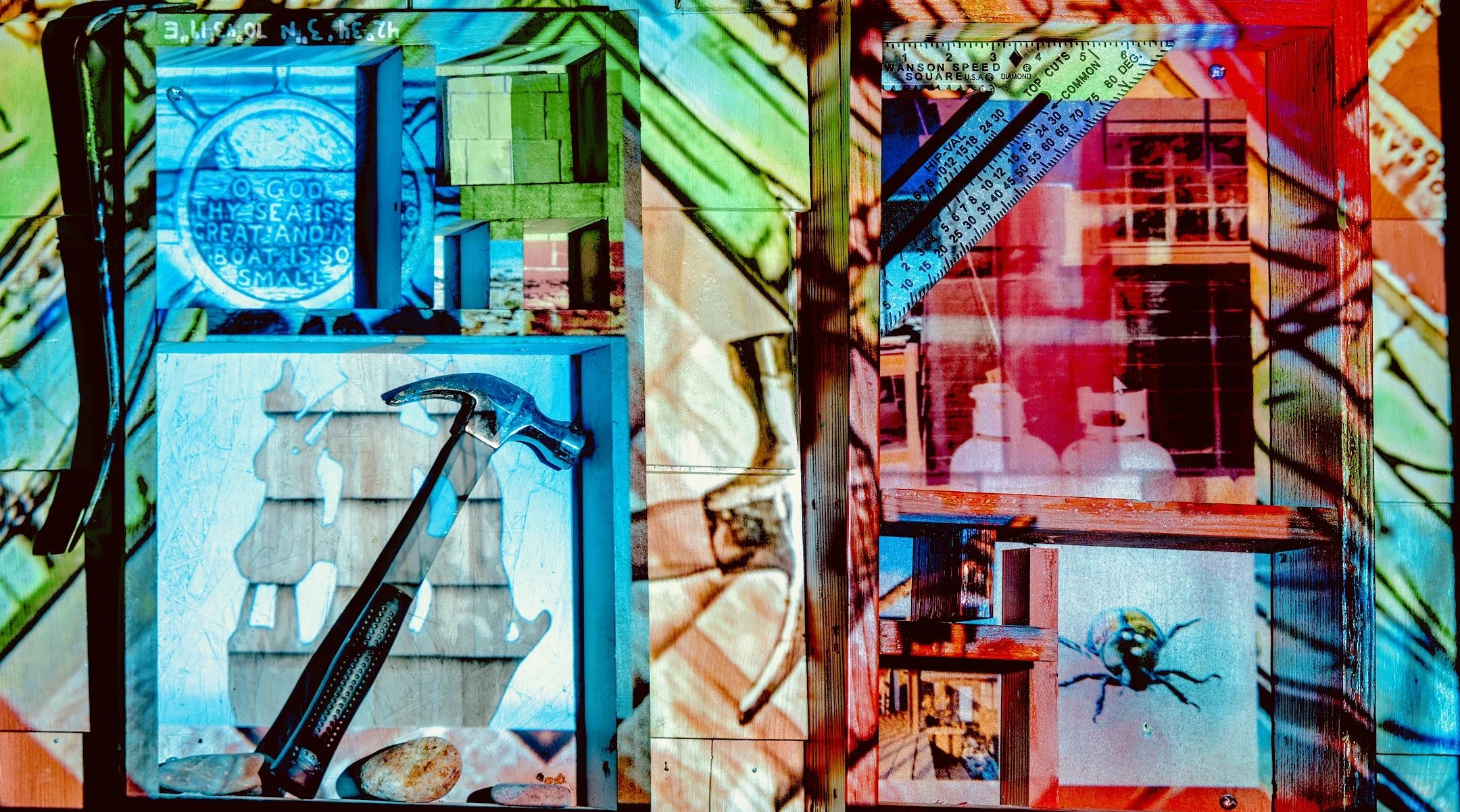 Site-specific video collage with original sound design installed for the time-based exhibition Gradient of Moving Images. Learning How to Shingle explores intergenerational relationships through the transfer of skills and knowledge. Repurposed wood and shingles become canvases for nested video projections that evoke surreal dimensions of depth, time, and space. Supersaturated digital images are thrown onto weathered lumber, contrasting old and new methods, and prompting the eyewitness to consider the transformative passage of time.