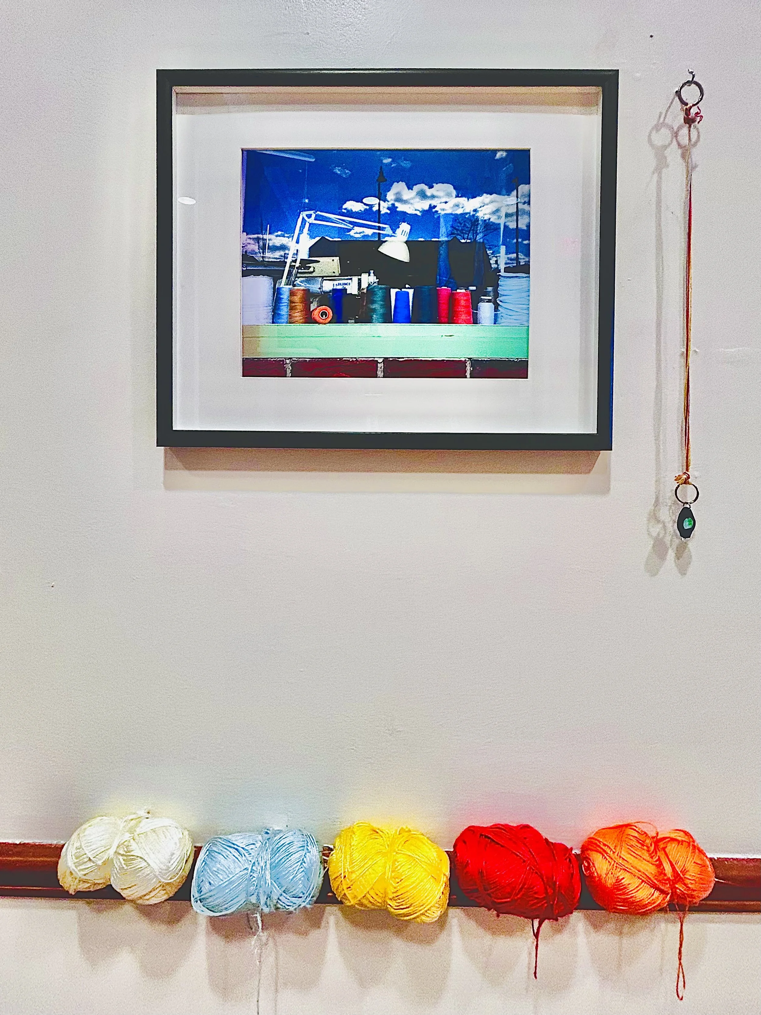 ‘Stitches in Time’ tells two stories. The first is visible: Hyper-saturated and colorful cones of thread float in reflections of impossibly blue sky and cloud evoking the distance between memory and time. The intersection of Rantoul Steet and Elliot Street in Beverly, Massachusetts, where this light was foraged, has been home to countless working families and their businesses for generations.
